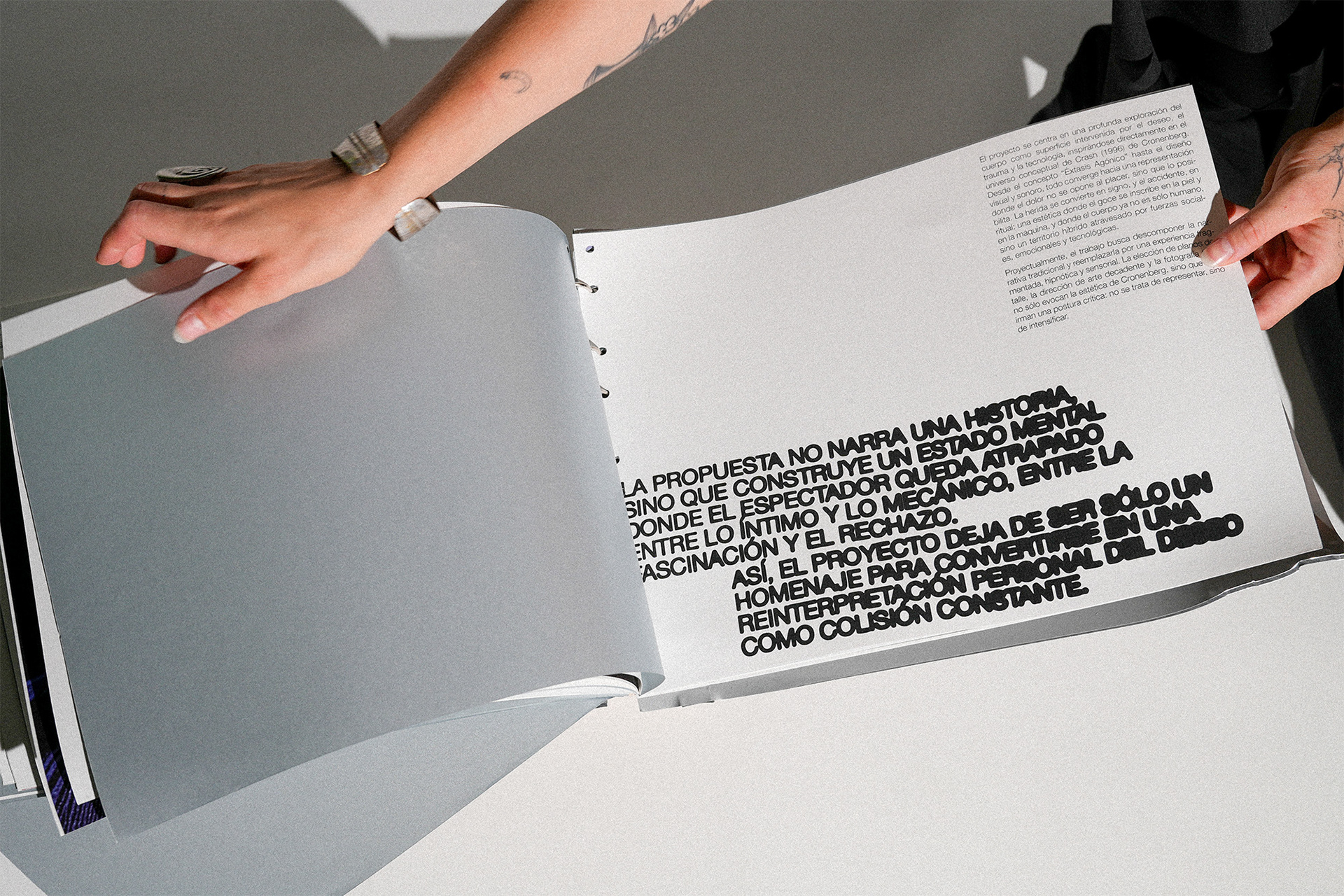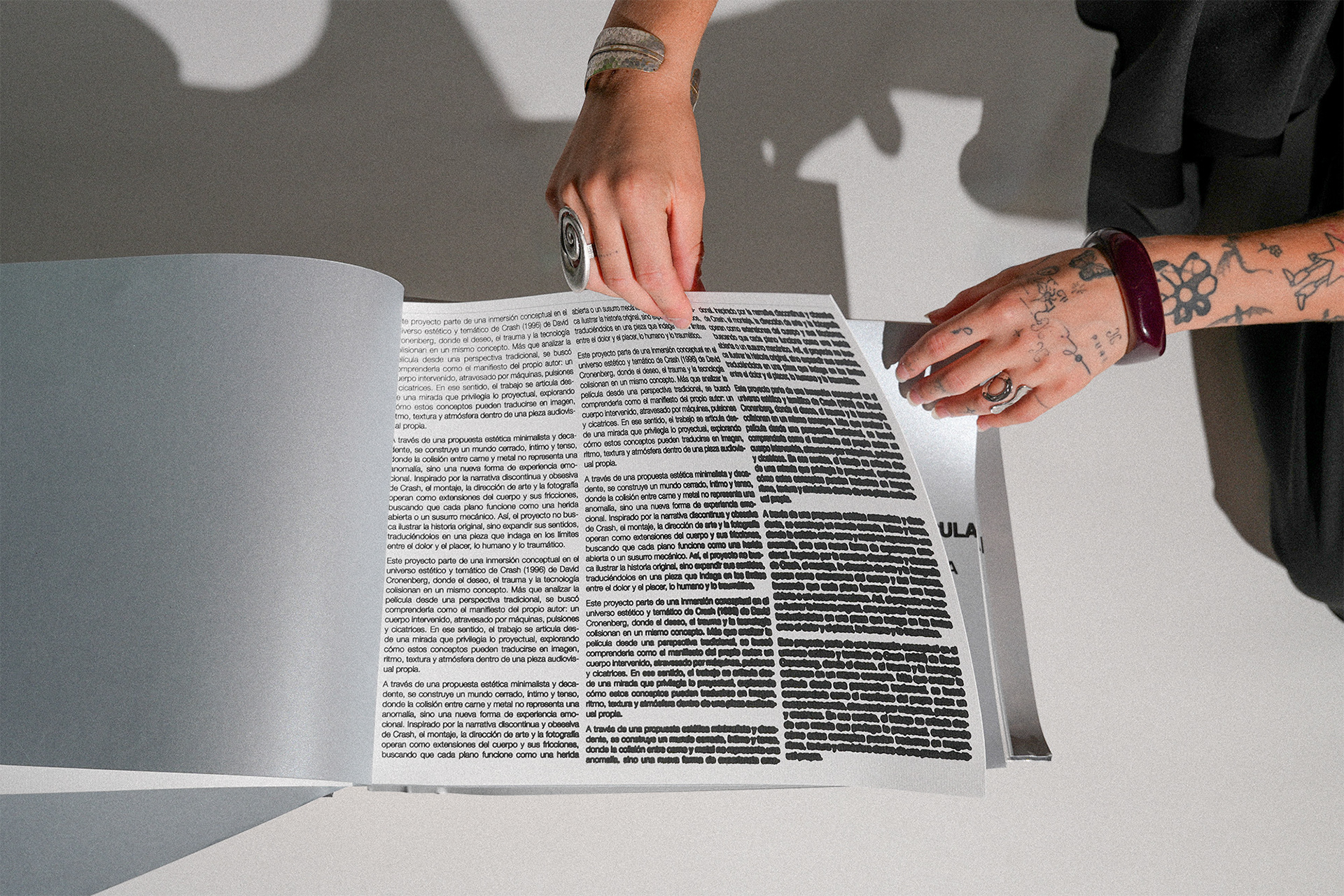 An editorial piece that extends the visual and conceptual language of the film into print, with a design that reflects its clinical and metallic atmosphere. It gathers the cinematic analysis, the conceptual and narrative development of our audiovisual piece, and all the art direction decisions