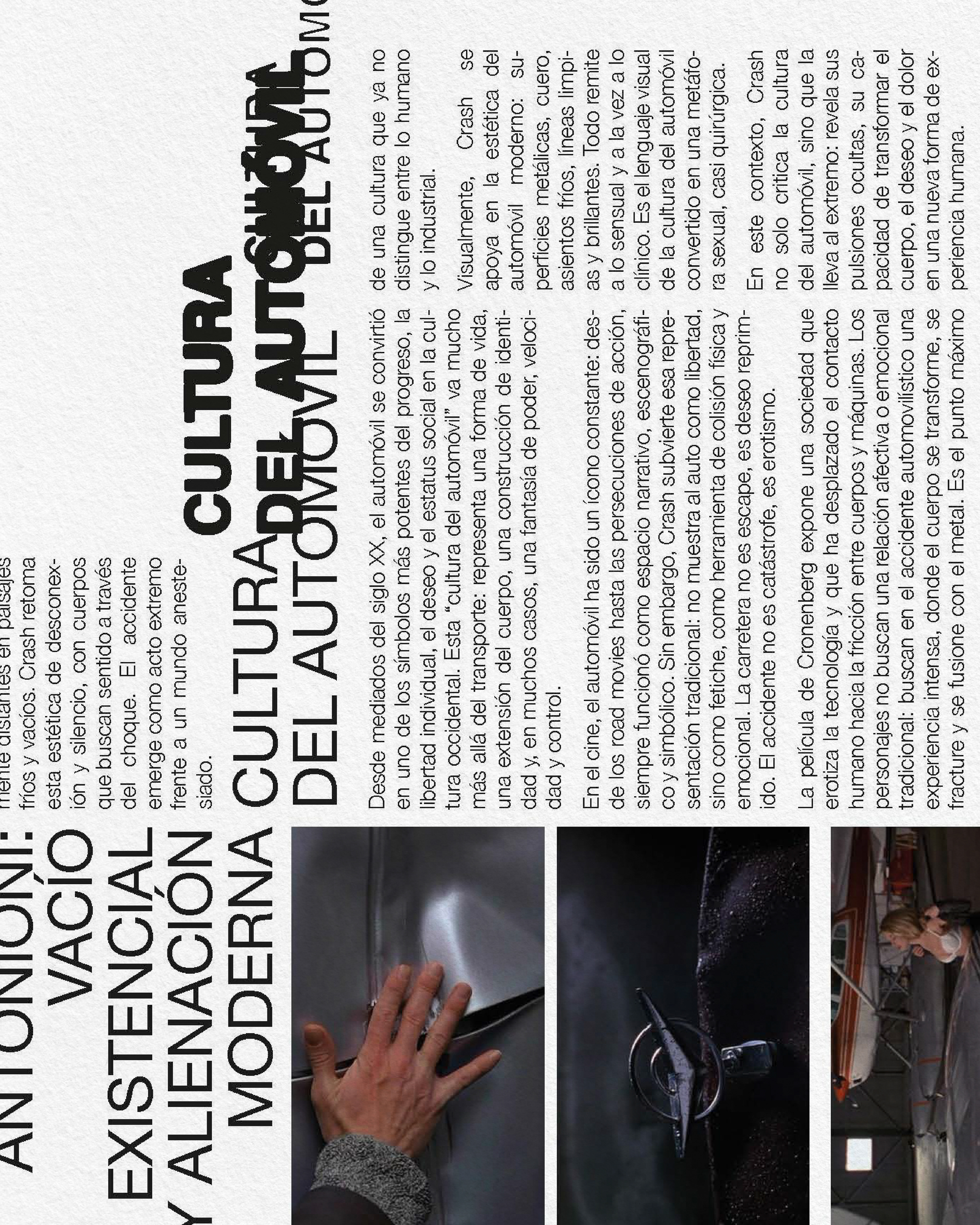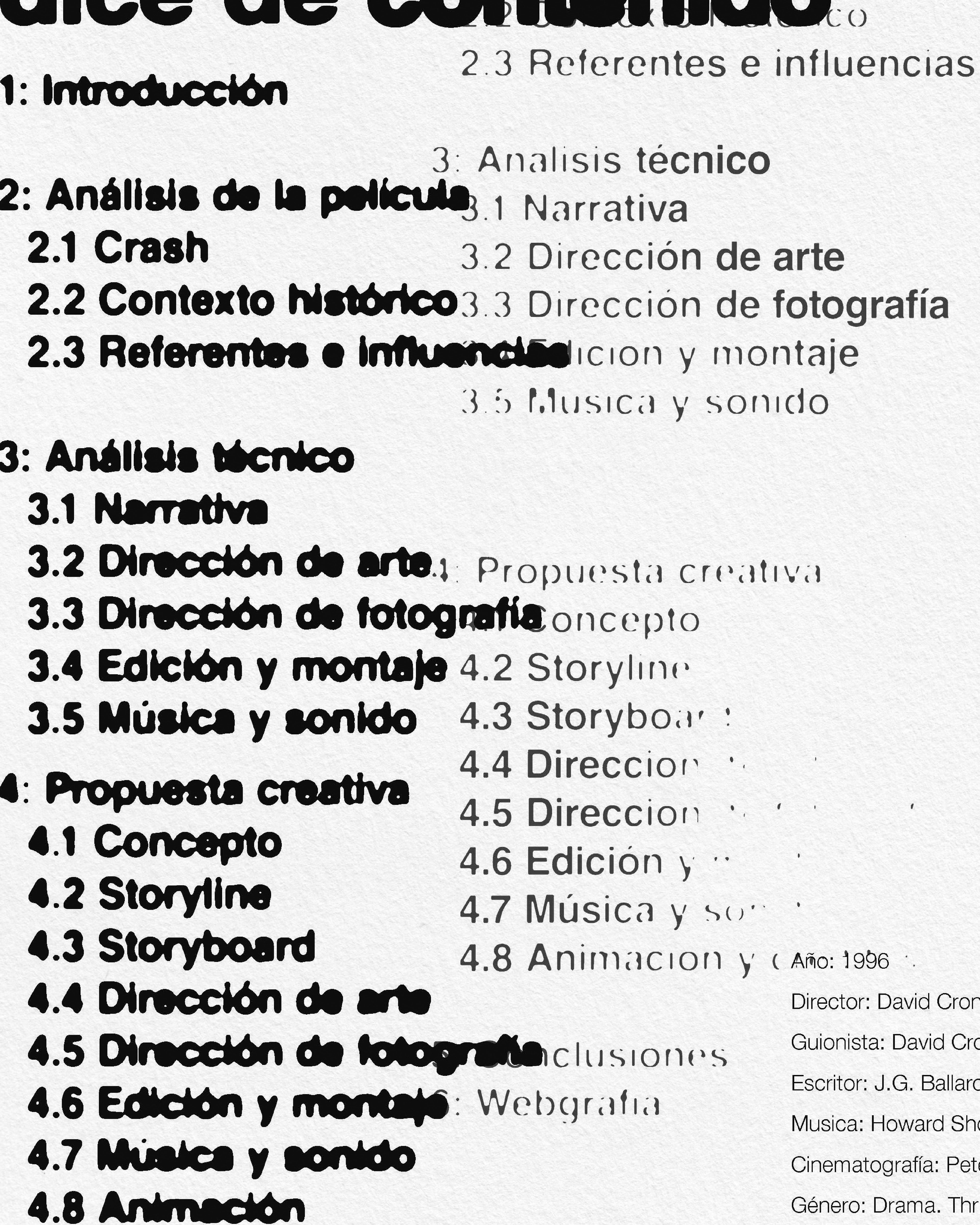 CRASH. Title sequence for Crash (1996) by David Cronenberg, reinterpreting its universe as a bodily manifesto where desire, trauma, and technology intertwine. The art direction translates these concepts into image, rhythm, and texture through a minimalist and decadent aesthetic. The typographic design is based on decomposition and fusion, evoking the disintegration of the body and the tension between pleasure and wound.