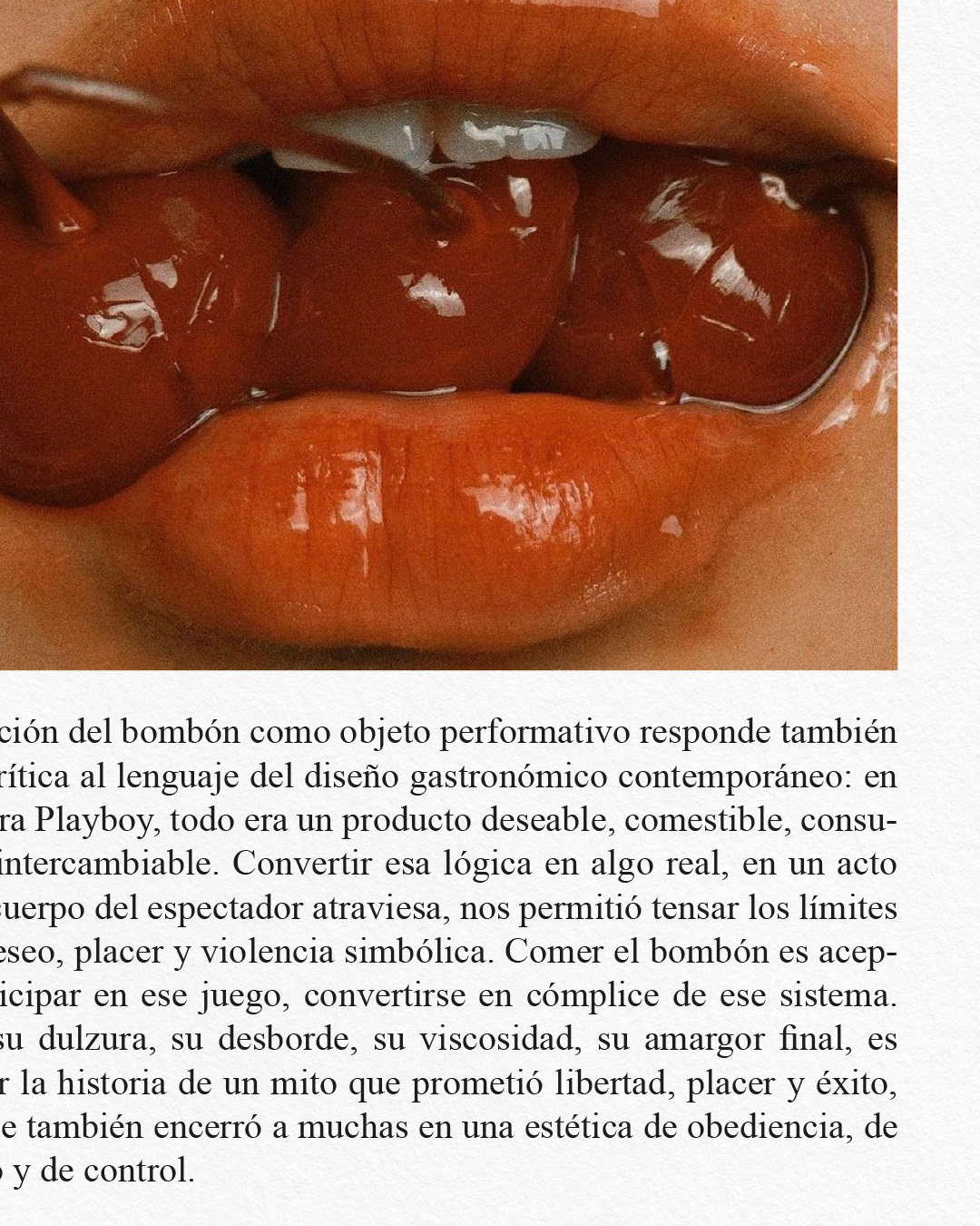 A performative and sensorial project that reimagines the Playboy Mansion through a critical lens. Centred around a sculptural edible piece, it stages a reflection on consumption, desire and female representation. The experience unfolds through the design and crafting of the bonbon, the creation of an immersive environment, a live performance and an editorial piece that documents the process. It transforms seduction into critique, using taste, touch and image as tools for reflection on power and intimacy.